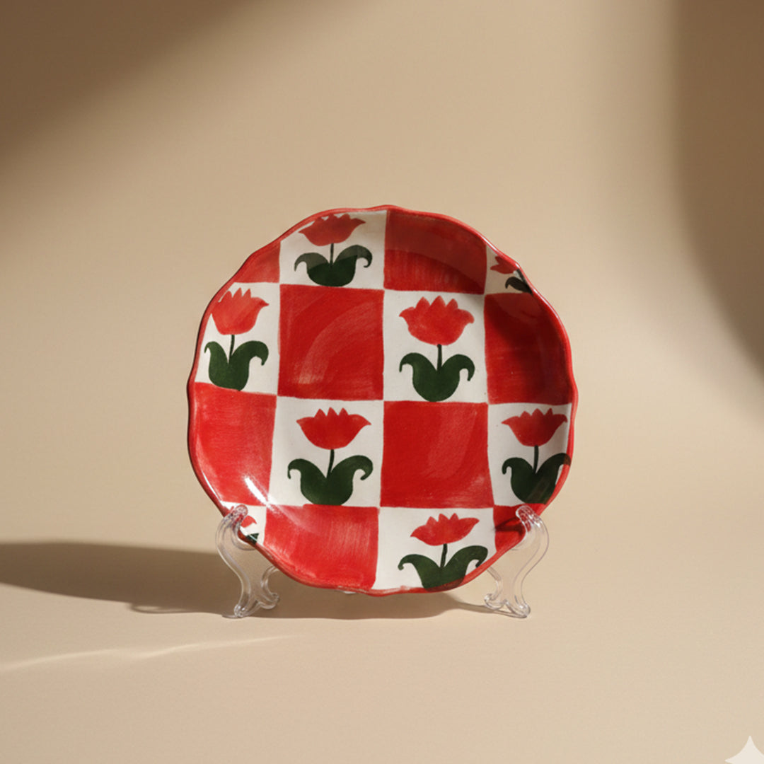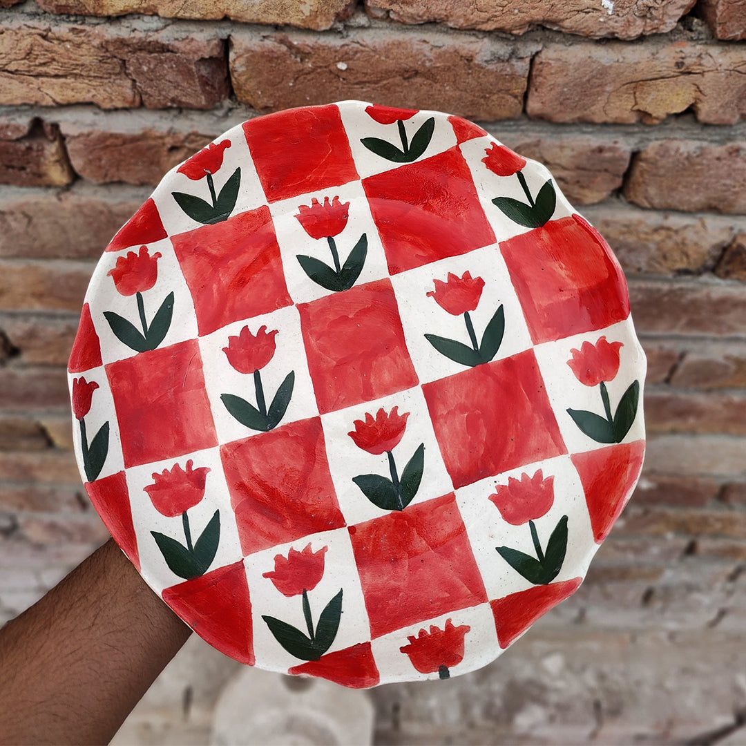 Hand-painted in red tulips (gul-e-lala) in a checkered fashion, this plate is made for you to enjoy a full meal in, bestie! <3