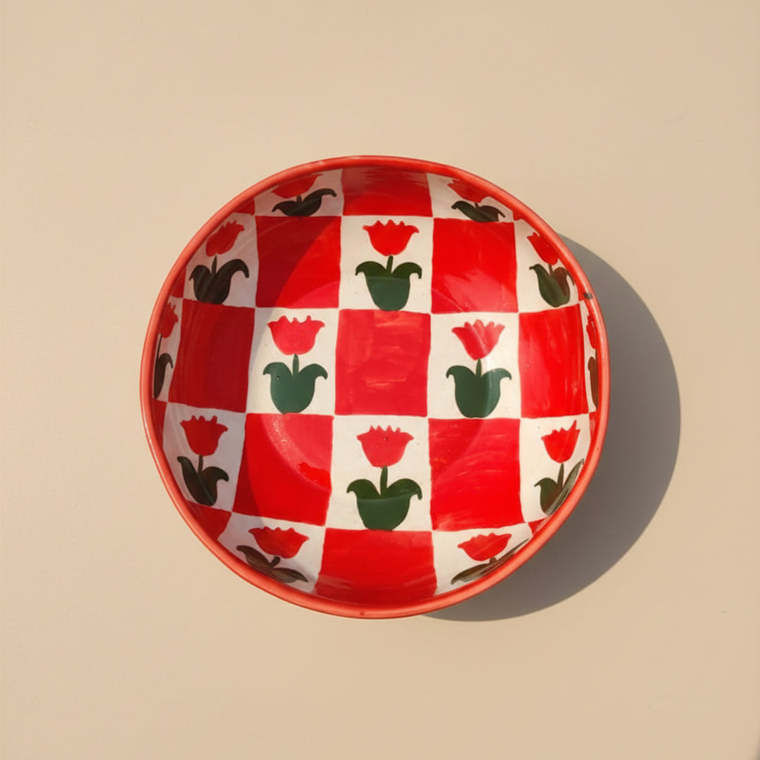 Hand-painted in red tulips (gul-e-lala) in a checkered fashion, this small bowl is made for you to enjoy soups and salads.