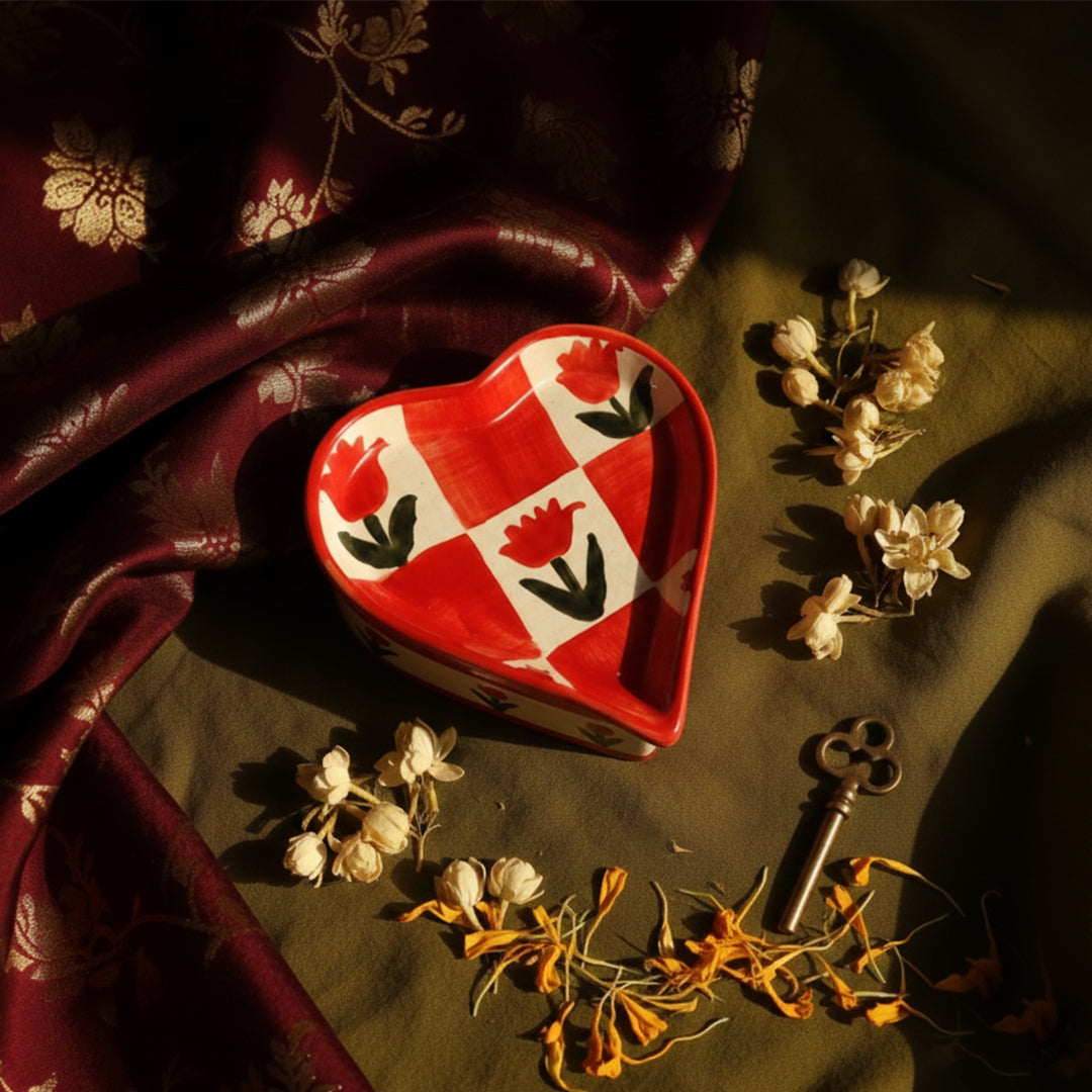Hand-painted in red tulips (gul-e-lala) in a checkered fashion, this heart shaped jewelry box is made for you to store ur trinkets in. You may also store eatables if you like! <3