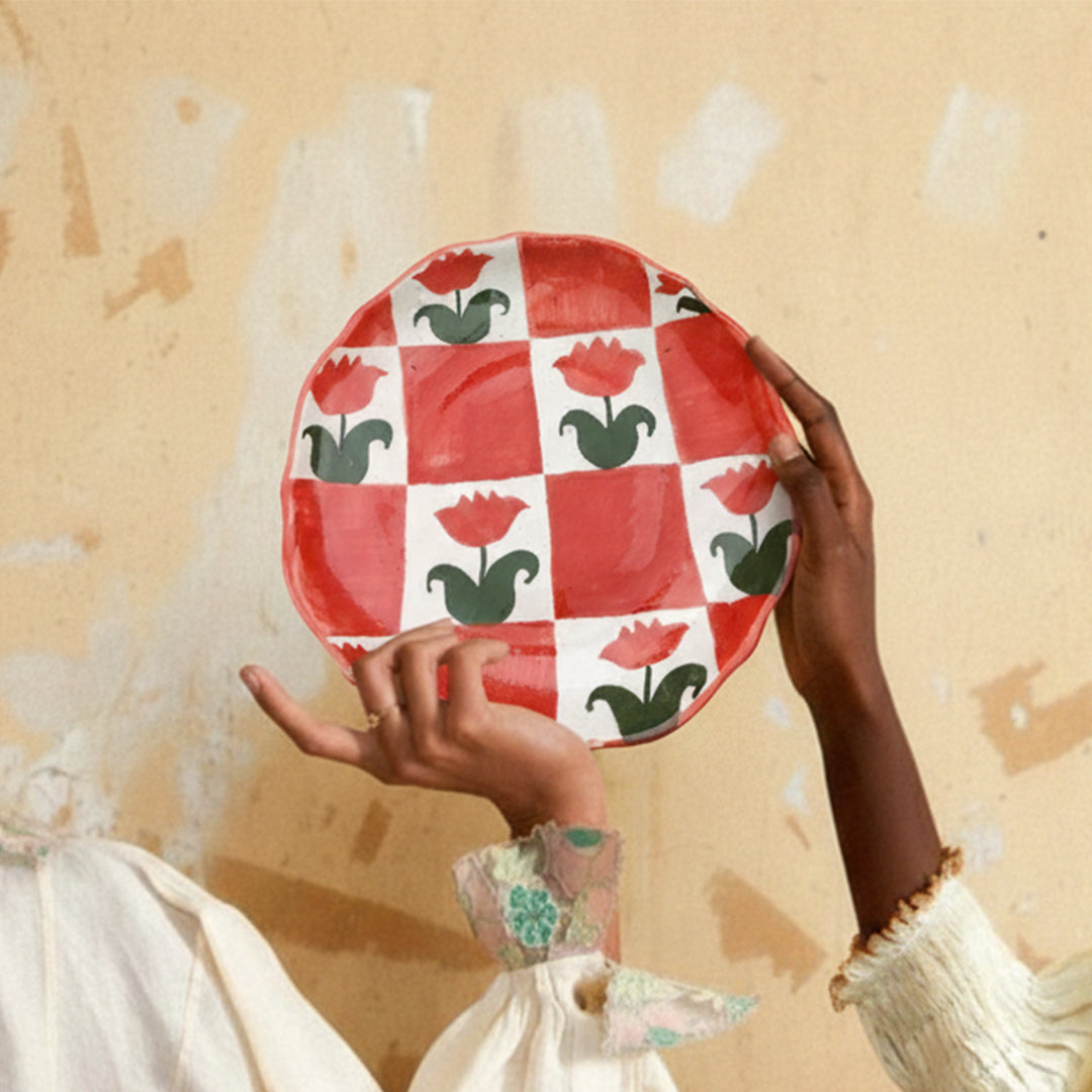 Hand-painted in red tulips (gul-e-lala) in a checkered fashion, this quarter plate is made for you to enjoy your snacks in.